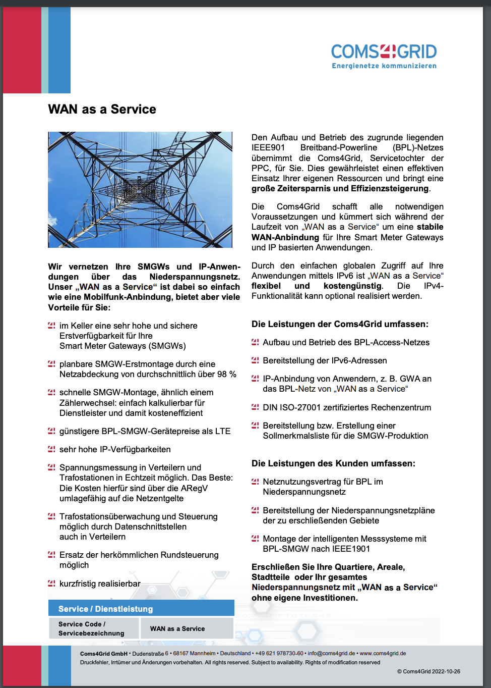 Beim Teilnetzbetrieb werden nur abgegrenzte Bereiche des Kommunikationsnetzes, wie zum Beispiel das BPL- Netz des Kunden betreut. Die IP-Anbindungen zur Versorgung des BPL-Netzes erfolgen entweder durch den Kunden selbst, oder werden ebenso von uns betreut. Der Kunde ist hier in der Lage selbst zu entscheiden, welche Bereiche er selbst und welche von der Coms4Grid übernommen werden sollen. - Zeitlich befristeter Betrieb